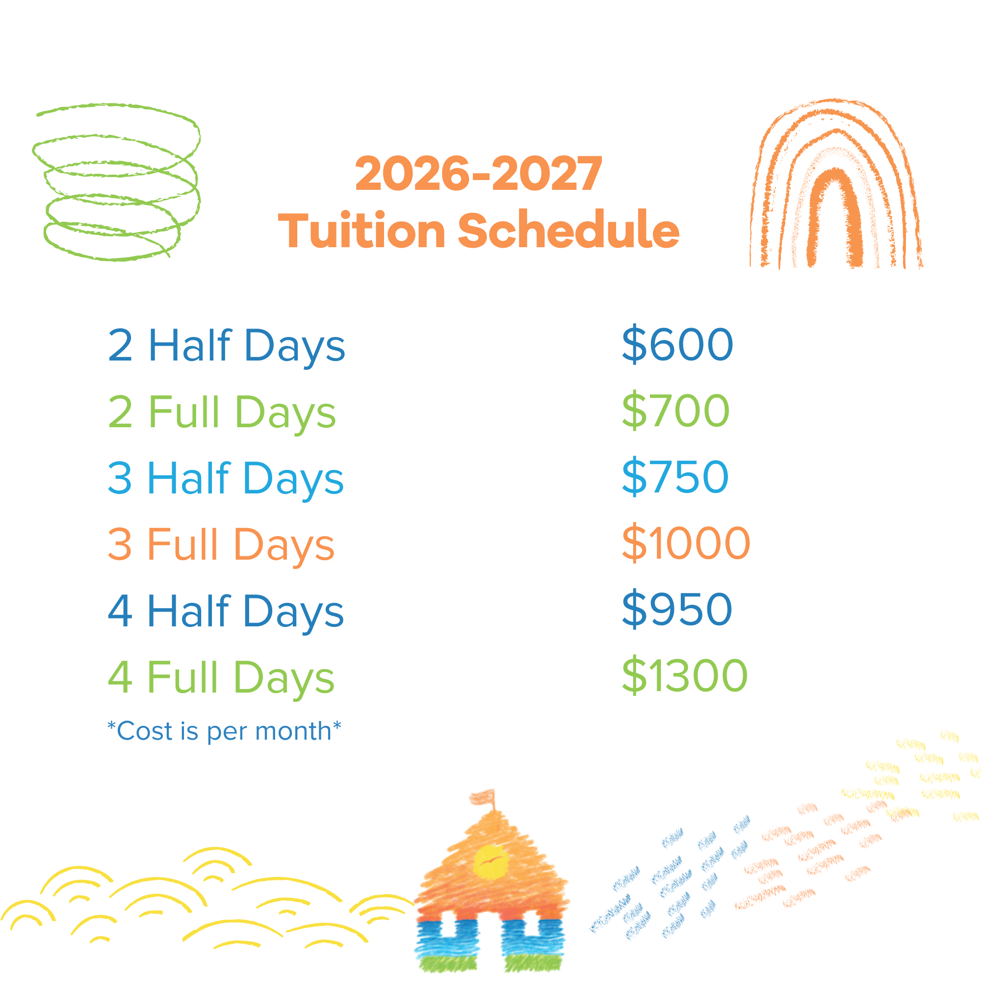 Our rates will stay the same for the 2026–2027 school year. For families who may choose a mix of several full days and a Friday half day, I will personally follow up with your exact tuition once you reach out to register, so it can be tailored to your schedule.