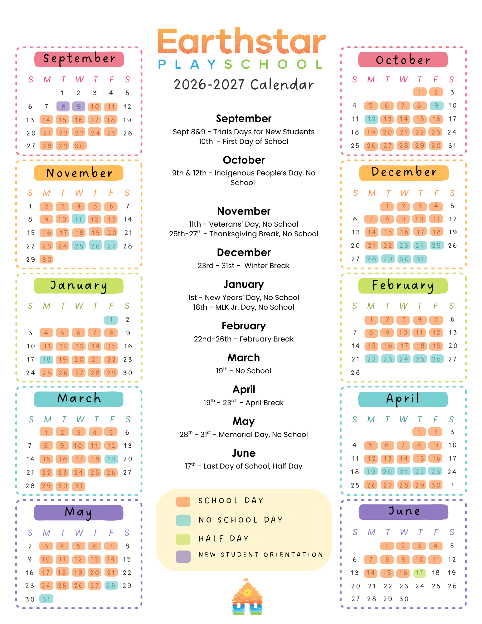 Time to register for the 2026-2027 school year at Earthstar Play School! We will be accepting children with birth dates between January 1, 2023 through December 31, 2024. We are registering for 2-day, 3-day, and 4-day spots. Families are welcome to choose between our half day (8:20-12:30) and full day (8:20-3:00) options. Please note the slightly later start time.